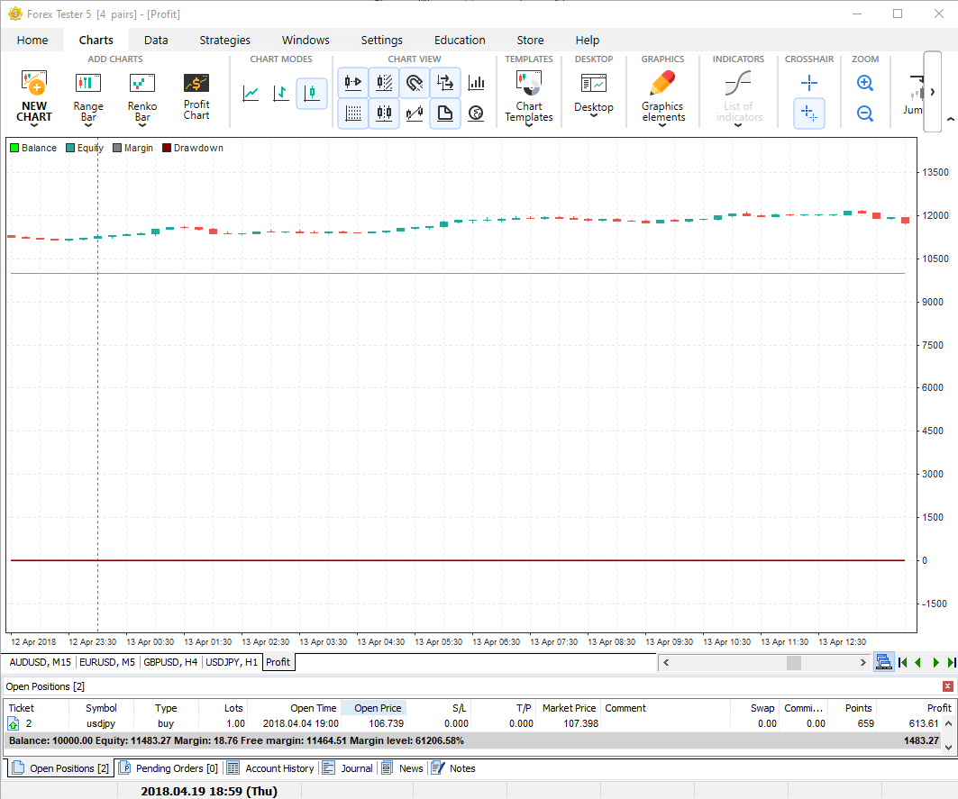 The profit chart will help to see the biggest changes in balance, equity, margin and drawdowns. It is a great indicator for the strongest and weakest aspects of your trading.