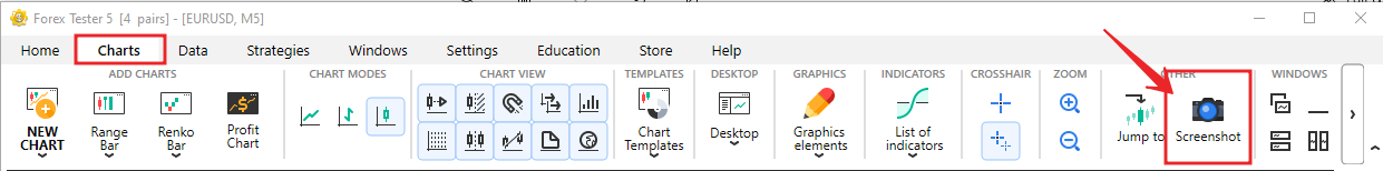 Forex Tester allows you to train your skills on Japanese candle sticks, bars, range bars, lines, and custom charts like Heikin Ashi. All the charts (regardless of their type) are synchronized and can be used simultaneously.