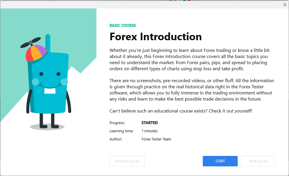 Forex Tester allows you not only to backtest your trading ideas but also to learn Forex right in the software using interactive built-in courses!