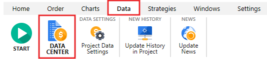 Historical data can be imported via the Data Center window only. To access the Data Center, please click the “Data Center” button on the Data tab: