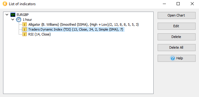 You can edit indicator properties, delete indicators, or delete all indicators on all charts at once.