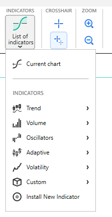You can add an indicator or oscillator to the chart by clicking the “List of indicators” button  on the Home tab.
