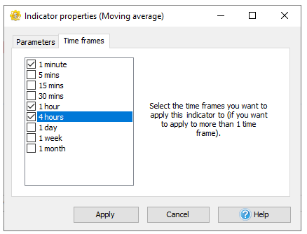 We recommend you to place indicators only on those timeframes where you need them. Activate the necessary timeframes on the Timeframes tab:
