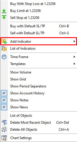 In addition, you can right-click on the chart and select “Add Indicator”.